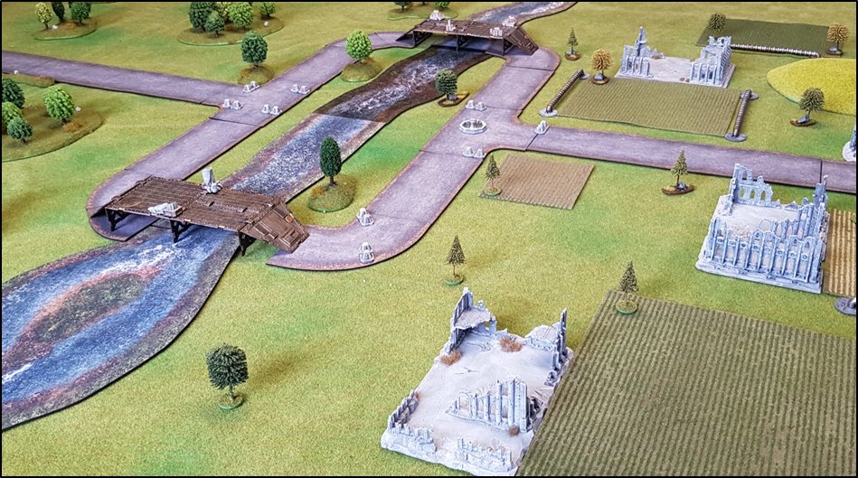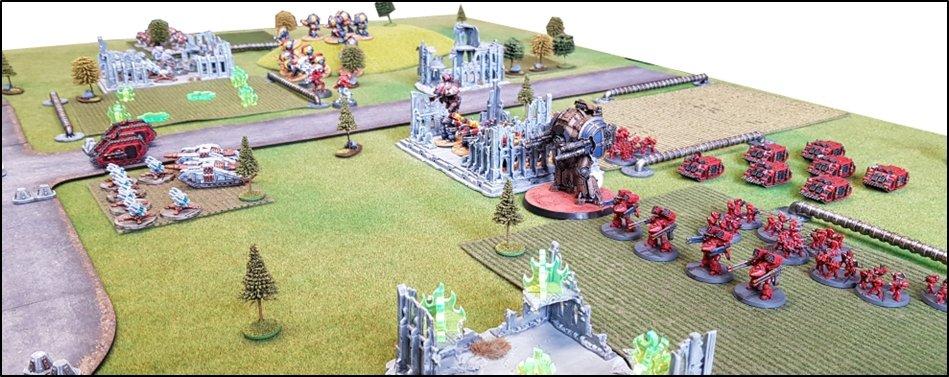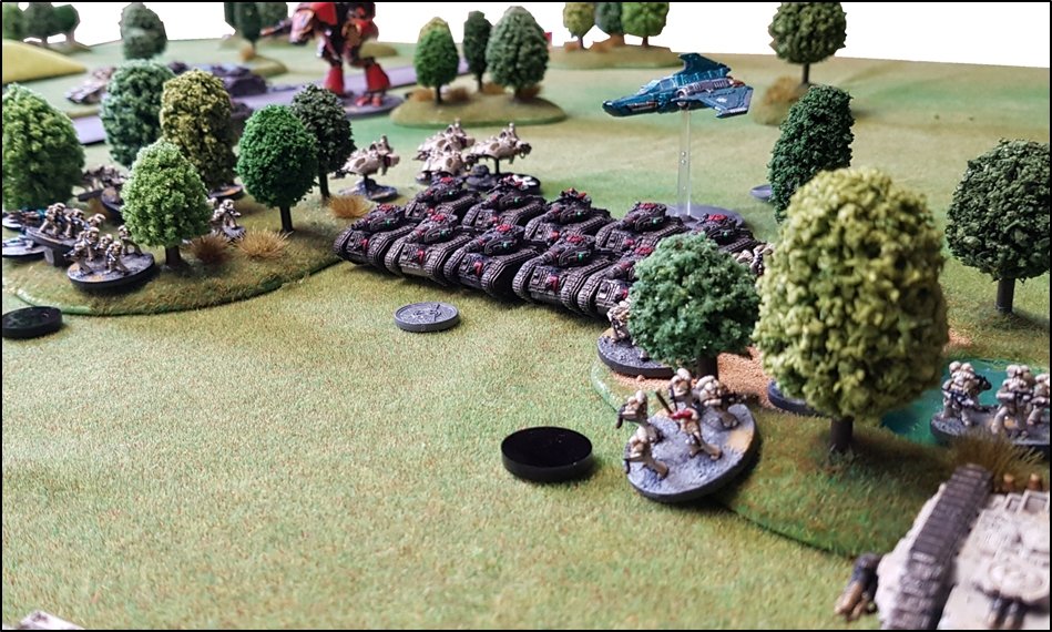 LE DESTIN TRAGIQUE DU PONT ALPHA Sur le flanc gauche des renégats, l'infanterie de la Death Guard, des Légionnaires avec Soutien Plasma et Lance-Missiles, progressait lentement vers le pont Alpha. Derrière elle avançait un important escadron de pas moins de dix Leman Russ Demolisher des Cthonian Headhunters. ![]() Les unités de soutien de la Death Guard et de l'Alpha Legion sont déployées dans les bosquets près de la rivière ![]() Les loyalistes avaient quant à eux envoyé des hordes de Dreadnoughts