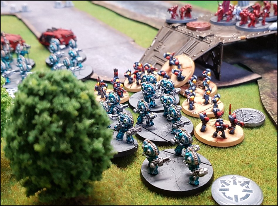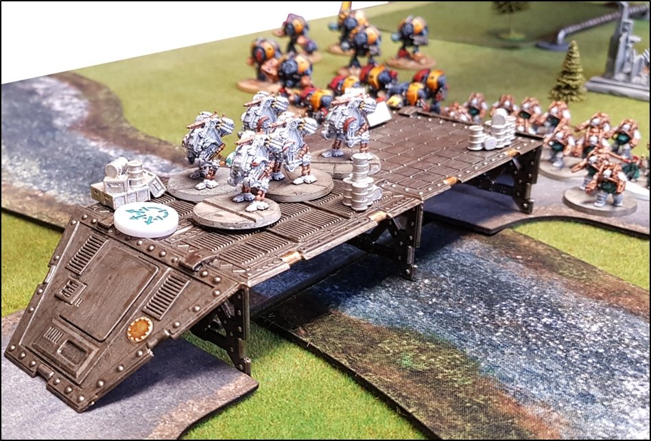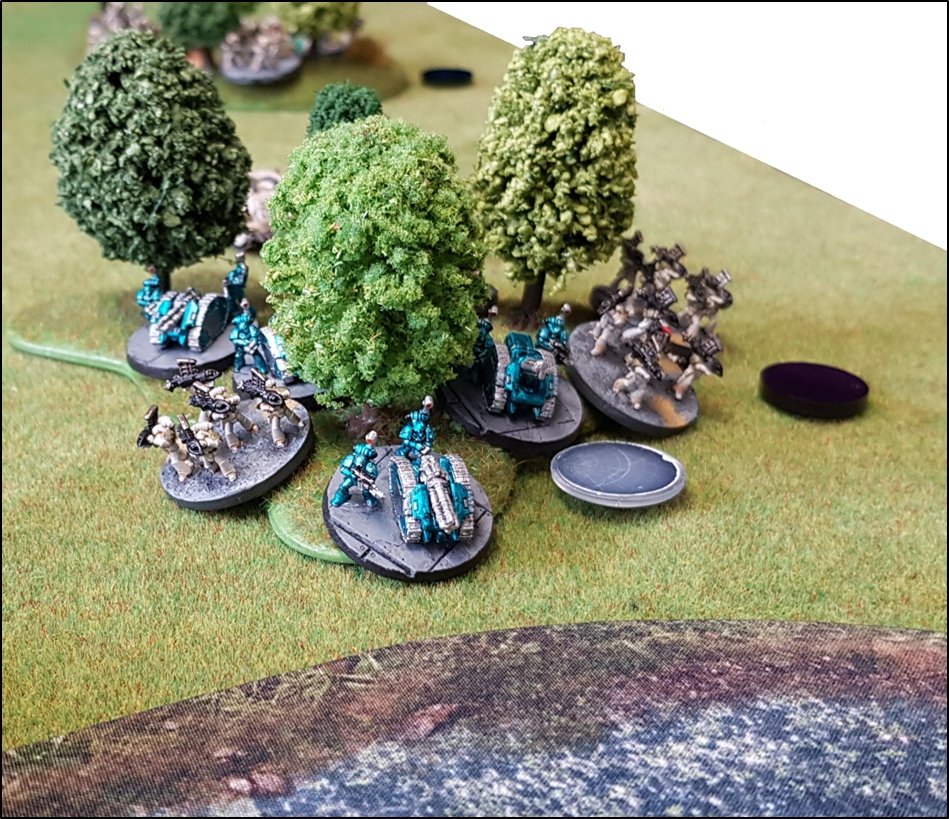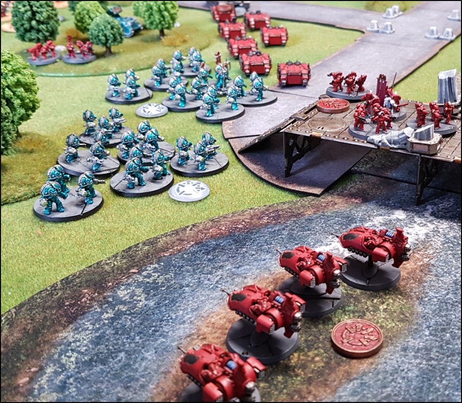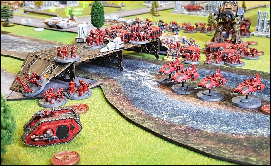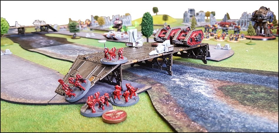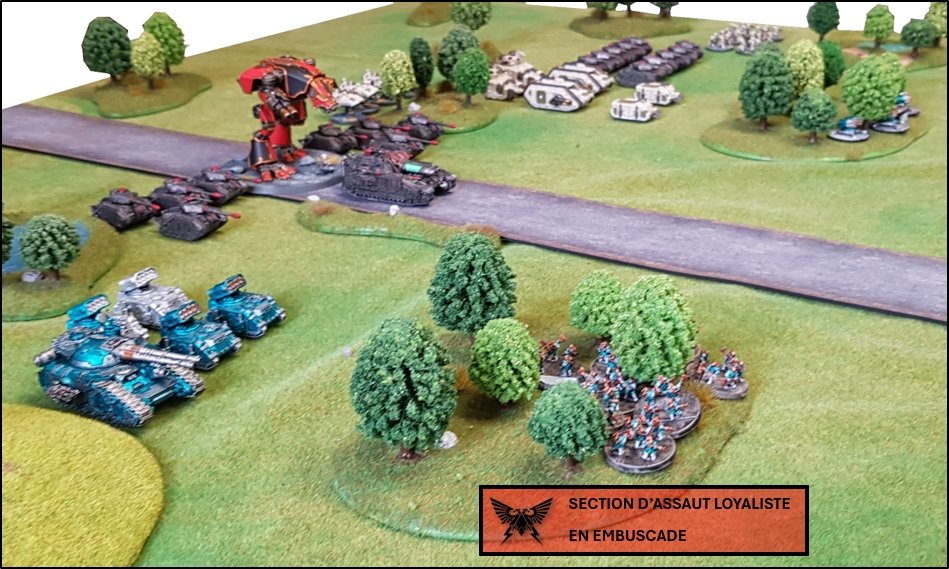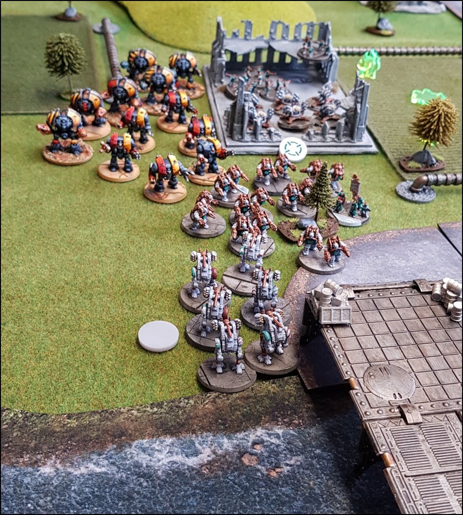 objectifs de la bataille à venir. Quelques heures plus tôt, une intense bataille avait eu lieu au-dessus de la rivière, chacun des deux camps cherchant à obtenir la supériorité aérienne. Ni les loyalistes, ni les renégats n'avaient pu revendiquer la victoire et, pendant les combats, une unité Arvus transportant un haut dignitaire de l'Imperium porteur d'informations stratégiques avait été abattu. L'appareil s'était crashé dans la Lyr et les troupes impériales avaient pour ordre de récupérer les données et de les évacuer avant que les traîtres ne puissent s'en emparer. De leur côté, les renégats avaient reçu l'ordre de sécuriser les forêts par lesquelles ils arrivaient pour permettre aux convois de troupes et d'armes de circuler librement jusqu'au front. ![]() Mission : River Crossing (The Rises of the Dark Mechanicum) Objectif Secondaire des Loyalistes : Vital Intel Objectif Secondaire des Renégats : Defiant Calven Reach était fermement défendue ainsi que l'apprirent rapidement les traîtres lorsqu'ils arrivèrent en vue de la rivière. En effet une section d'assaut de Veletaris s'était dissimulée dans un bois et ne fut détectée qu'au dernier moment par les éclaireurs de l'Alpha Legion. Même si les troupes de contact des Cavaliers des Cendres furent immédiatement décimés, en particulier par le tir de barrage d'un escadron de Whirlwinds de la XXème Légion, leur présence obligea l'état-major renégat à ralentir voire même à faire reculer une partie de son dispositif sur son flanc droit, permettant ainsi à une partie des forces loyalistes de progresser plus librement sur le champ de bataille en direction du Pont Beta. ![]() Une Section d'Assaut loyaliste s'était infiltrée au-devant des premières lignes renégates pour y semer la confusion...