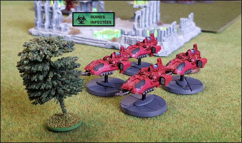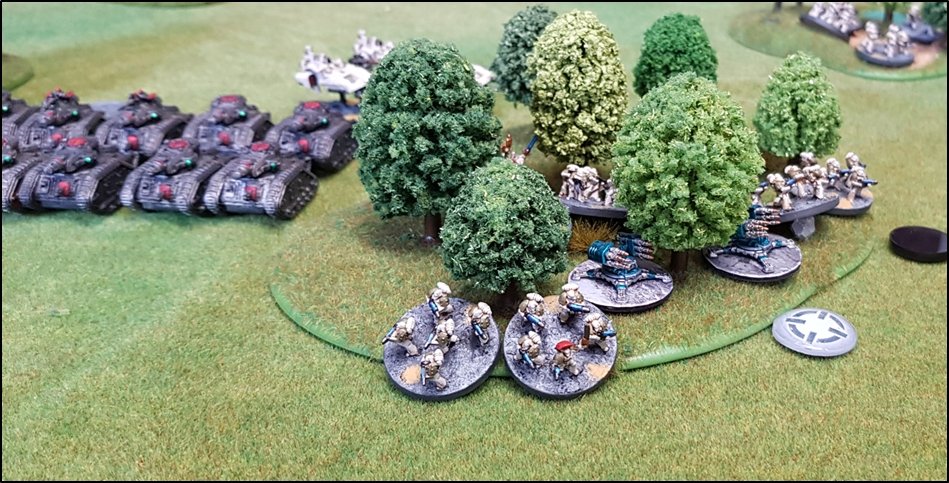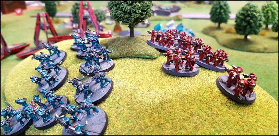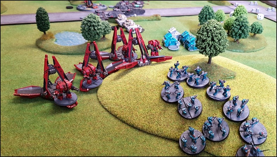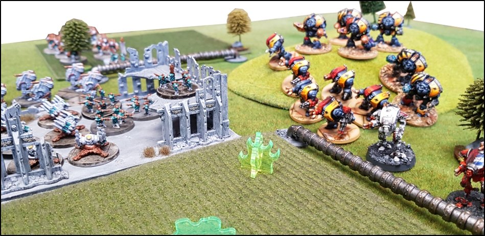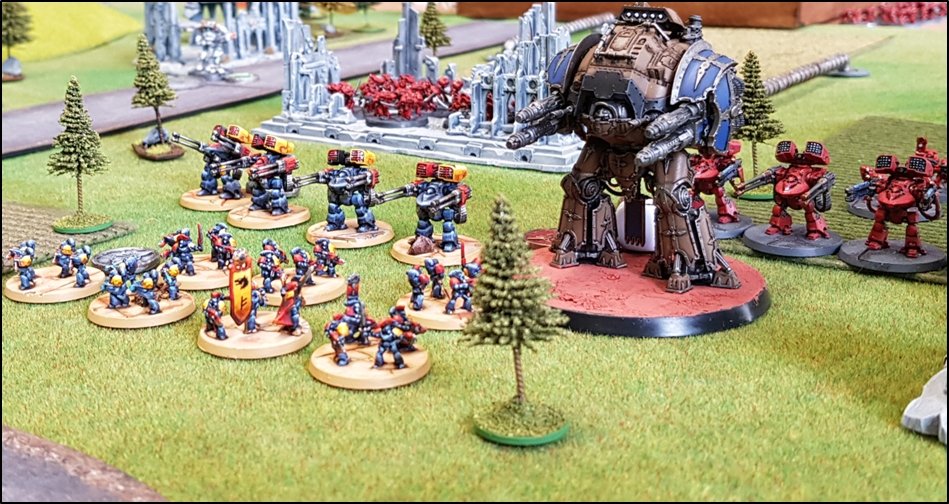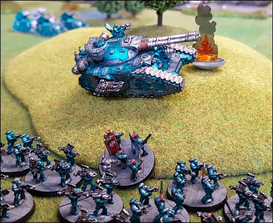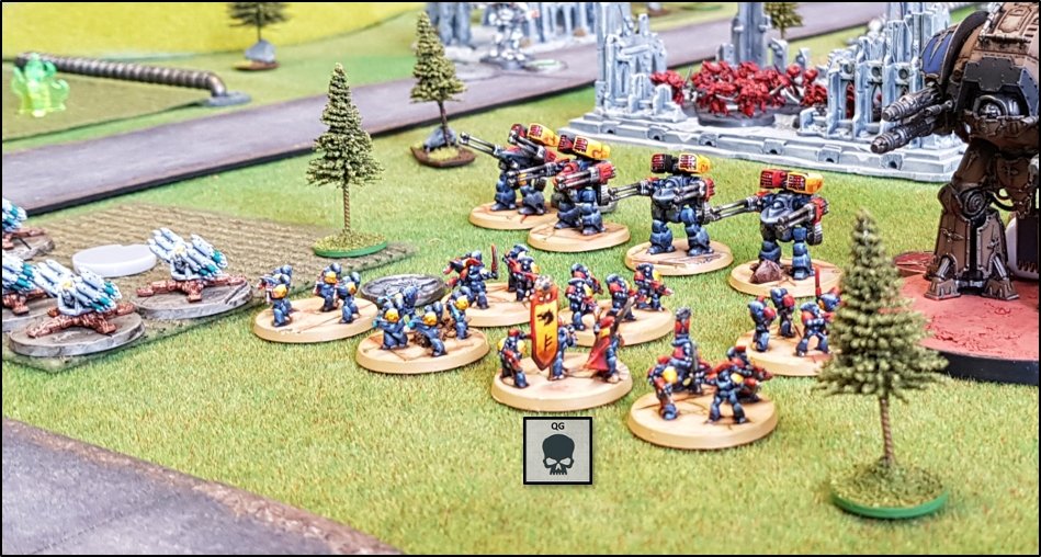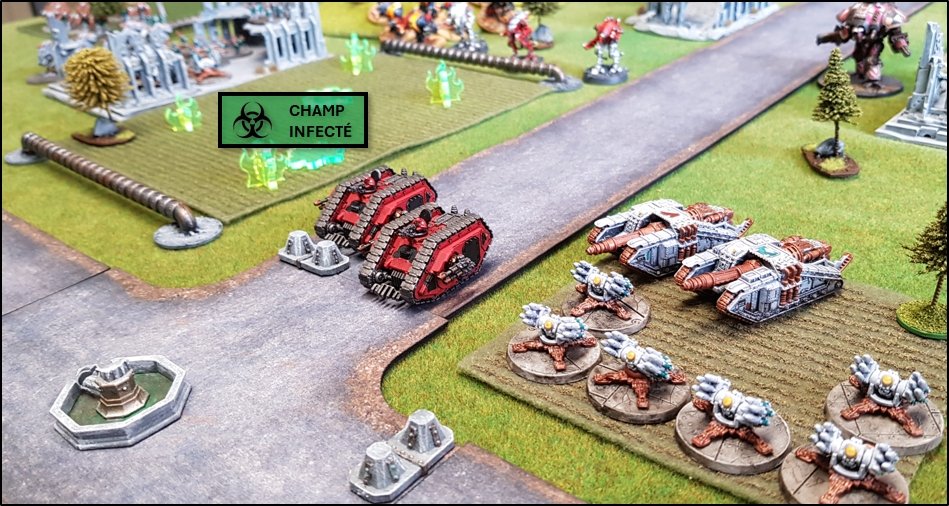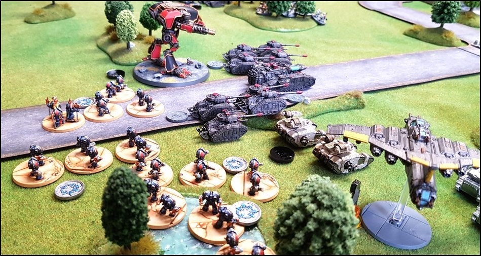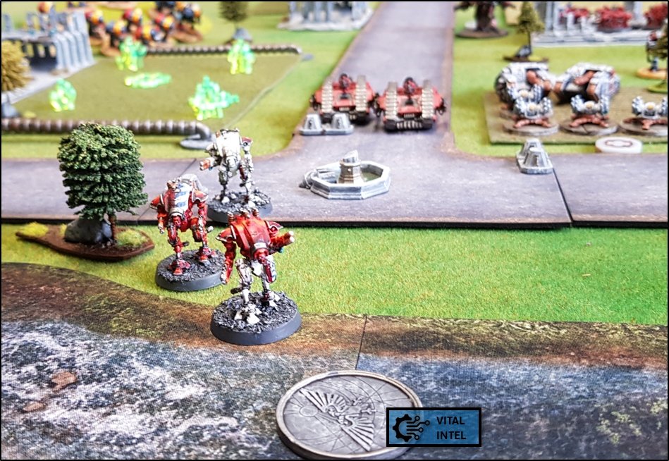 objectifs de la bataille à venir. Quelques heures plus tôt, une intense bataille avait eu lieu au-dessus de la rivière, chacun des deux camps cherchant à obtenir la supériorité aérienne. Ni les loyalistes, ni les renégats n'avaient pu revendiquer la victoire et, pendant les combats, une unité Arvus transportant un haut dignitaire de l'Imperium porteur d'informations stratégiques avait été abattu. L'appareil s'était crashé dans la Lyr et les troupes impériales avaient pour ordre de récupérer les données et de les évacuer avant que les traîtres ne puissent s'en emparer. De leur côté, les renégats avaient reçu l'ordre de sécuriser les forêts par lesquelles ils arrivaient pour permettre aux convois de troupes et d'armes de circuler librement jusqu'au front. ![]() Mission : River Crossing (The Rises of the Dark Mechanicum) Objectif Secondaire des Loyalistes : Vital Intel Objectif Secondaire des Renégats : Defiant Calven Reach était fermement défendue ainsi que l'apprirent rapidement les traîtres lorsqu'ils arrivèrent en vue de la rivière. En effet une section d'assaut de Veletaris s'était dissimulée dans un bois et ne fut détectée qu'au dernier moment par les éclaireurs de l'Alpha Legion. Même si les troupes de contact des Cavaliers des Cendres furent immédiatement décimés, en particulier par le tir de barrage d'un escadron de Whirlwinds de la XXème Légion, leur présence obligea l'état-major renégat à ralentir voire même à faire reculer une partie de son dispositif sur son flanc droit, permettant ainsi à une partie des forces loyalistes de progresser plus librement sur le champ de bataille en direction du Pont Beta. ![]() Une Section d'Assaut loyaliste s'était infiltrée au-devant des premières lignes renégates pour y semer la confusion...