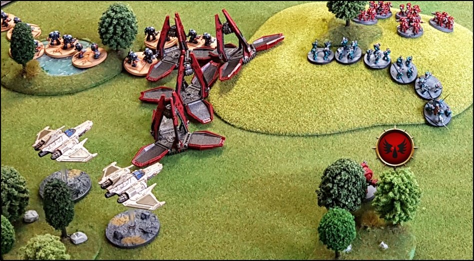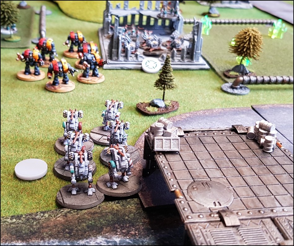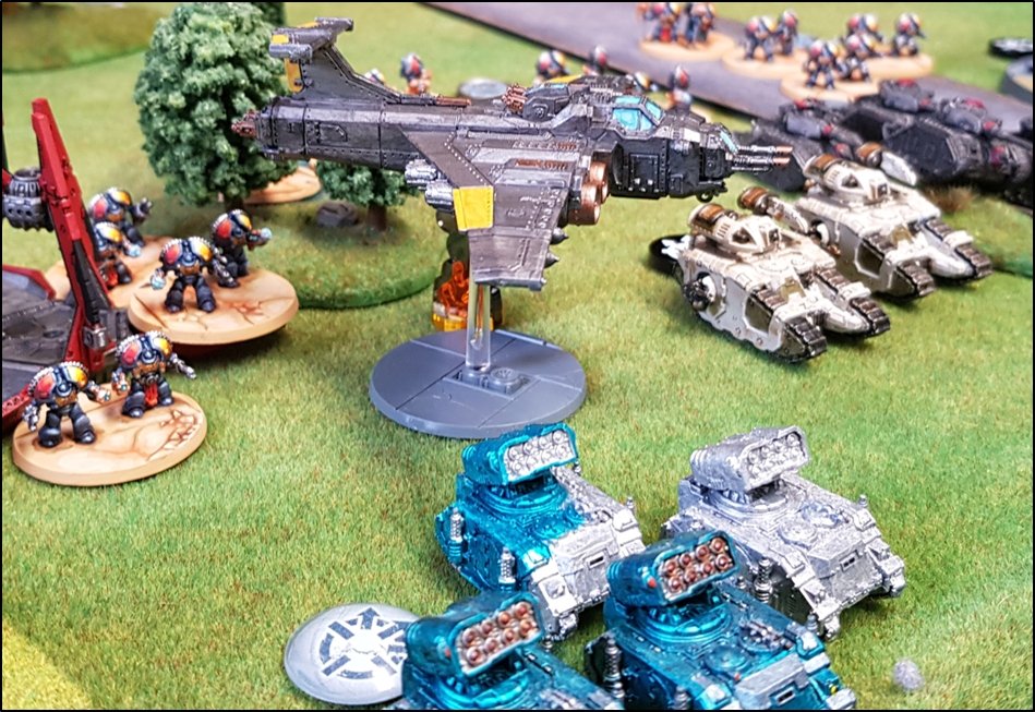 Leviathans des Blood Angels ! ![]() Les Terminators Saturnine Space Wolves apparaissent dans le dos des renégats ! ![]() Les Terminators Blood Angels engagent un Détachement Tactique de l'Alpha Legion ! ![]() Des Modules d'Atterrissage permettent aux Dreadnought Leviathan Blood Angels de se déployer derrière les lignes ennemies ! Profitant de la confusion, l'infanterie des VIème et IXème Légions s'emparèrent du pont Beta. ![]() Les Blood Angels et les Space Wolves sécurisent le Pont Beta Bien que pris entre le marteau et l'enclume, les renégats ne paniquèrent pas. Un Marauder des Cthonian Headhunters effectua un passage pour larguer un tapis de bombes sur les Dreadnoughts Leviathan des Blood Angels, détruisant trois des quatre machines. ![]() Passage à basse altitude du Bombardier Marauder des Cthonian Headhunters