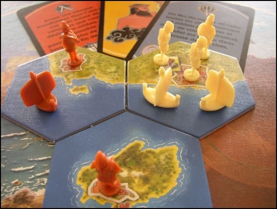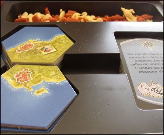 d'hexagones et des cartes de jeu répartis en 3 pioches distinctes