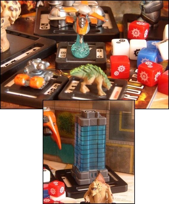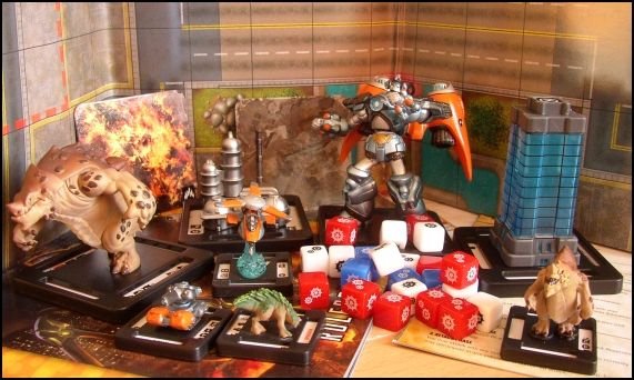 Précisons d'abord que la photo ci-dessus n'est pas faite à partir du matériel d'un seul starter set. Dans un tel Starter Set, il y a (normalement) un Monstre (sous sa forme normal et ultra, donc deux figurines), un bâtiment (avec un tuille recto-verso à utiliser quand il est détruit), quatre unités, des dés, un compteur de points de vie (manque de bol ce compteur était absent de mon deuxième starter set), des règles et une carte de jeu recto-verso. La qualité des figurines est très bonne. Tout est dans un style résolument cartoon. Les monstres sont très réussis (je suis vraiment sous le charme des Terrasaures). On notera cependant que certaines figurines sont moins réussies que d'autres au niveau de la peinture : si les Terrasaures et les Mangeurs de Mondes sont très beaux, les robots géants de la GUARD ou des Syndicats du Soleil d'Ombre manquent d'encrage, en particulier sur les parties métalliques.