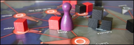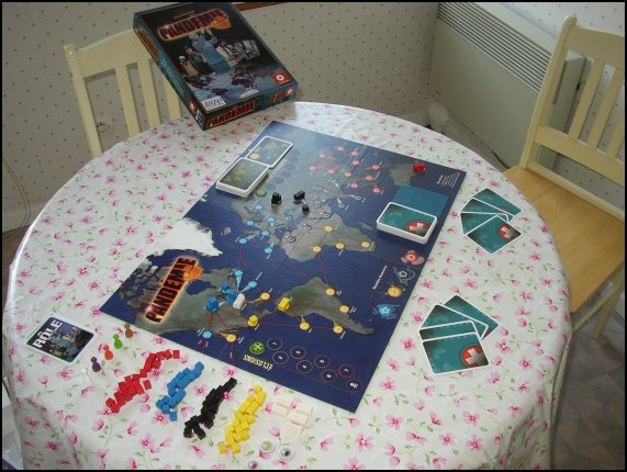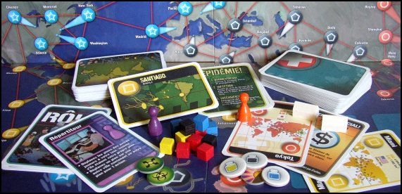 De manière général, le plateau de jeu, les pions en carton et les cartes sont plutôt de bonne qualité et bénéficient d'illustrations efficaces à défaut d'être particulièrement jolies. Le plateau représente la planète et les grandes villes touchées par les maladies. Le reste des éléments, pions des joueurs, cubes Maladie et autres stations de recherche, est en bois . C'est aspect sobre peut être rebutant mais il s'avère au final bien approprié au contexte. On s'imagine bien devant une espèce de carte d'état-major où la progression des maladies est représentée de façon abstraite. On irait même jusqu'à penser que remplacer ces cubes en bois par des pions en plastique représentant des bactéries pourrait même gâcher l'aspect visuel du jeu (tout en étant aussi moins pratique).