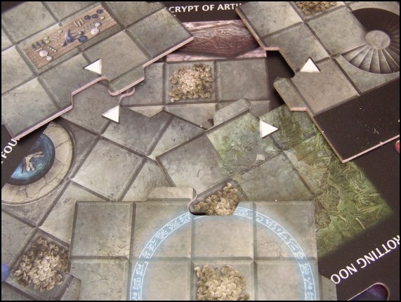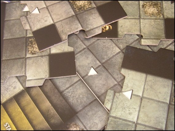 Après avoir avidement examiné les figurines de la boite sous toutes les coutures, le regard est ensuite attiré par les sections de donjon qui se trouvent au coeur des mécanismes de jeu. Ces sections, en carton épais et solide, sont nombreuses mais pas très variées (corridor, petite salle, T ou coude) et le graphisme est tristounet bien qu'efficace. Pour apporter un peu de variété, certaines sections "spéciales" sont disponibles sous la forme de lieux spéciaux tels que l'antre des différents "grands méchants", laboratoire, escalier caché, etc. Rien à dire de particulier, c'est efficace mais pas comparable à ce qui a été fait pour la dernière version de Space Hulk par exemple. Ceci dit cela rend aussi le donjon homogène ce qui est important car la configuration du donjon est aléatoire et nécessite donc des sections absolument compatibles entre elles.