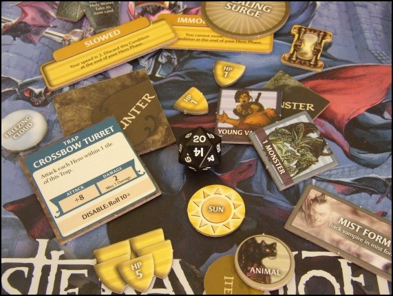 Outre les section de donjon, on trouve une véritable horde de pions (toujours en carton épais) très variés : fiches de personnages et de "grands méchants", pions de point de vie, pions de rencontres et de monstres, etc. La très grand majorité des pions n'est utilisée qu'au cours des divers aventures ce qui est très luxueux (la plupart du temps un simple tableau et/ou l'utilisation d'un d6 auraient été suffisants) et un peu perturbateur pour le joueur qui, après avoir lu les règles de base, peut se demander par exemple dans quel paragraphe on parle des 10 pions "cercueil" qu'il est en train d'examiner...