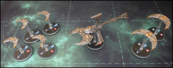 (Frégates - Classe 1), au centre un Vaisseau-Moissonneur Scythe