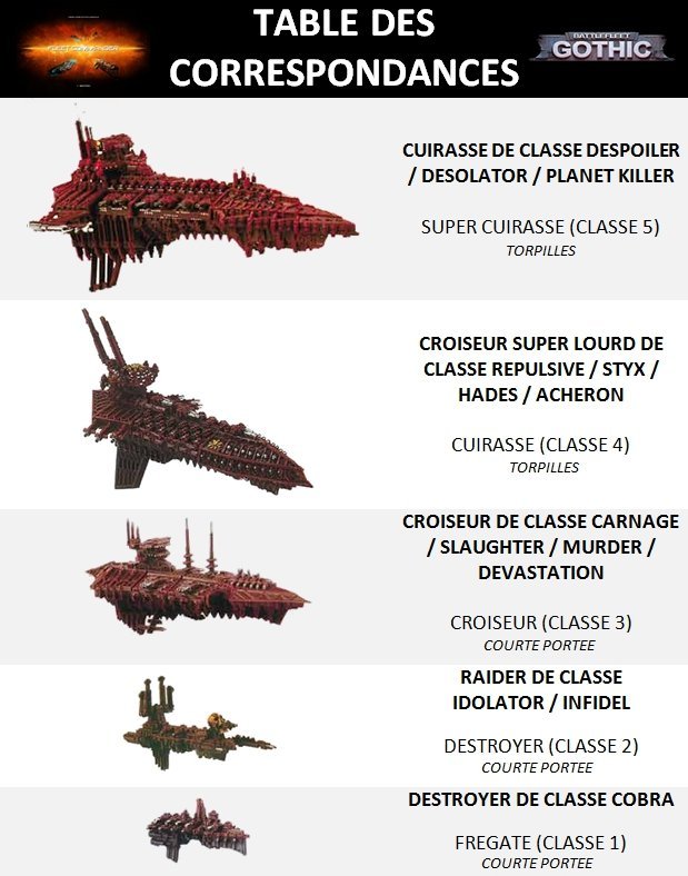 ![]() Avec quelques aménagements, on peut utiliser les figurines Battlefleet Gothic du Chaos pour représenter une flotte classique Fleet Commander. Pour ce faire il suffit d'utiliser les figurines selon la table des correspondances suivante :