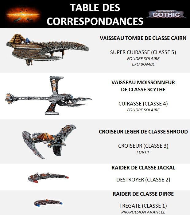 ![]() JOUER NECRON EN COUNT AS CLASSIQUE On peut parfaitement utiliser les figurines Battlefleet Gothic des Nécrons pour représenter une flotte classique Fleet Commander. Pour ce faire il suffit d'utiliser les figurines selon la table des correspondances suivante :