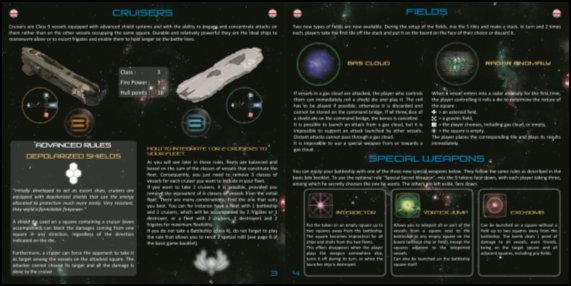 L'ajout de ces nouveaux vaisseaux apportent également une nouvelle dimension au jeu puisque dorénavant les joueurs pourront commencer à varier leur flotte et à jouer des parties non symétriques. Les nouveaux terrains permettent également de varier les stratégies. Le Nuage de Gaz se différencie du Champ d'Astéroïdes car il permet d'attaquer depuis cette position tout en bénéficiant d'un dé de bouclier gratuit en cas d'attaque ennemie. L'Anomalie Radar quant à elle cache sa véritable nature (Nuage de Gaz, Champ d'Astéroïdes, Champ Gravitique ou rien) jusqu'à ce qu'un vaisseau entre dans sa case. Les trois nouvelles armes spéciales de Cuirassé sont l'Interdictor (qui rend une case bloquante pour les mouvements et les tirs), la Porte Vortex (qui permet de téléporter un groupe de vaisseaux) et l'Exo-Bombe (qui fait subir un point de dommages à tous les vaisseaux de la case ciblée ainsi qu'à ceux des cases adjacentes). Ces nouvelles armes ne sont pas forcément au même niveau de puissance que certaines de la boite 1- Ignition mais elles apportent encore un peu plus de variété. On ne peut que conseiller aux joueurs de tirer les armes spéciales au hasard plutôt que de les choisir, le challenge en est d'autant plus relevé et amusant. Les règles des Batailles Multi-Secteurs introduisent les combats opposant jusqu'à huit joueurs. Cependant elles nécessitent logiquement d'avoir plusieurs boites de jeu pour fournir le matériel. Le champ de bataille est soit composé d'un énorme secteur soit divisé en secteurs indépendants reliés entre eux par des Portails. Les joueurs peuvent envoyer leurs vaisseaux d'un secteur à l'autre. Attention, tout comme pour les Champ Gravitique, le passage des Portails n'est pas entièrement maîtrisé et peut donner lieu à des surprises. L'éditeur affirme que des batailles à 8 joueurs (par équipe ou chacun pour soi) peuvent être jouées en 3h. Etant donné la simplicité des règles et leur rapidité, on le croit sans problème. ![]() Enfin