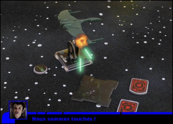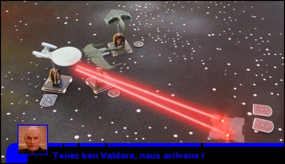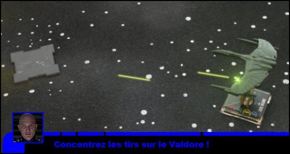 Journal de bord du capitaine... ...poursuivis par le Scimitar, deux oiseaux de proie romuliens sont intervenus pour nous porter secours! L'I.R.W. Valdore s'est immédiatement lancé dans la bataille malgré le tir nourri du Scimitar. Plus lent ou plus timoré, le commandant du croiseur D'deridex reste en retrait du combat engagé entre l'Enterprise, le Valdore et le Scimitar.