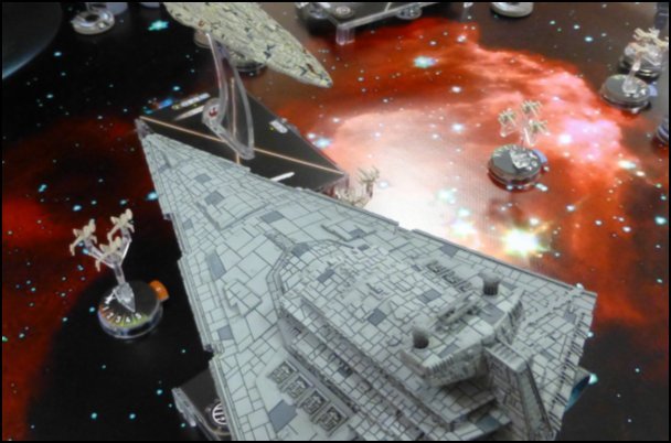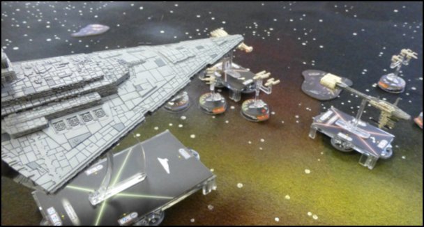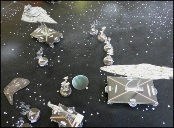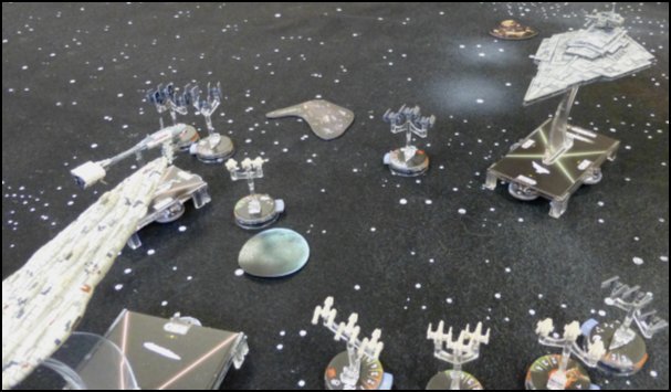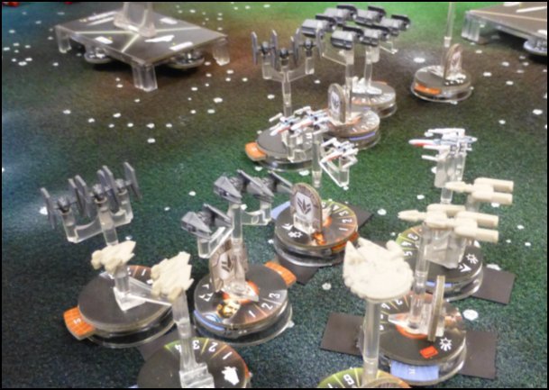 à l'ennemi de concentrer sa puissance de feu trop facilement. Les escadrons de chasseurs furent les premiers à entrer en contact, les Ailes X rebelles freinant l'avancée des chasseurs TIE afin de permettre aux lents Ailes B de manoeuvrer vers les destroyers impériaux. Pendant ce temps le Transport Rebelle escorté par une frégate MC30 fonçait à travers le champ de bataille pour tenter de forcer le blocus. Le croiseur Interdictor continuait quant à lui à manoeuvrer pour augmenter la taille de son champ d'interdiction et ainsi bloquer la flotte rebelle. ![]() Le