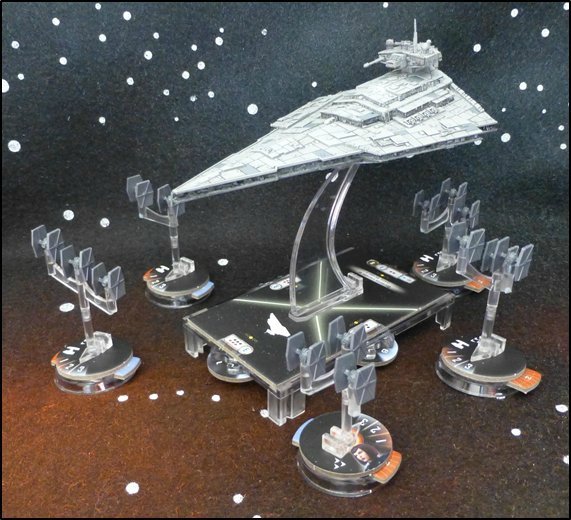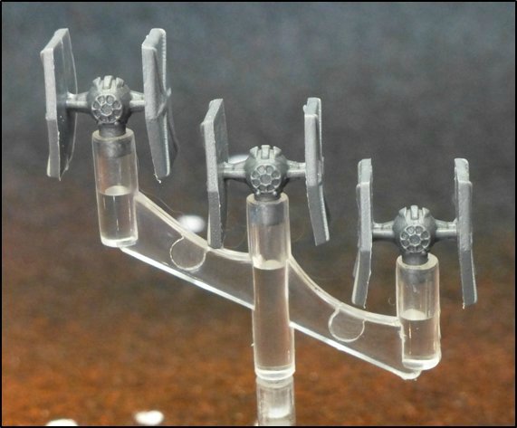 la détermination des lignes de vue. ![]() Il faut bien avouer que ces figurines ne sont pas de la même qualité que celle du Destroyer. C'est du plastique un peu mou et non peint, les figurines sont parfois un peu tordues (rien de très spectaculaire cependant) et la gravure est minimaliste. Un gros plan fait d'ailleurs assez mal : ![]() Ce n'est pas vraiment sexy. Mais, tout comme d'autres jeux utilisant des figurines de petite taille (tel qu'Epic Armageddon), cela n'a en fait pas grande importance car l'on ne voit ces défauts que si l'on met le nez dessus. Or c'est bien l'effet de masse qui importe et, sur les photos prises à distance raisonnable, cela passe totalement inaperçu. Il en sera de même au cours d'une partie. Point important pour ces figurines de chasseurs : on peut retirer les chasseurs du socle. Cela veut dire qu'on peut parfaitement imaginer créer l'escadrille de Vador constituée d'un TIE Advanced et de deux TIE Fighters. Autre point important : plusieurs socles différents sont fournis et permettent ainsi de présenter des escadrons ne volant pas tous dans la même formation... C'est un détail qui fait la différence au niveau de l'esthétique générale. Comme pour les vaisseaux de ligne, les socles des escadrons de chasseurs sont laids. Ils ont cependant le mérite d'être fonctionnels : il indiquent en effet les points de vie de chaque escadron (3 maximum pour des Chasseurs TIE, 5 pour des X-Wings), les capacités spéciales ou encore la présence ou non d'un personnages spécial. Un système de languette permet de savoir si l'escadron a été activé ou pas : on pousse la languette et on fait ainsi apparaître la couleur bleue ou rouge. Un pion d'initiative permet de savoir quelle est la couleur du tour en cours. C'est une bonne idée mais comme pour les écrans, il y a un risque de bouger les figurines par accident en voulant mettre à jour la valeur d'initiative ou les points de vie. Il est évident que le jeu n'est pas fait pour les joueurs psycho-rigides. ![]() Passons maintenant aux figurines