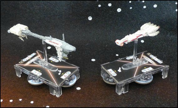 ![]() Les deux vaisseaux de ligne Rebelles sont une Frégate Nébulon-B et une Corvette Corellienne. Les deux figurines sont montées sur de petits socles (celui du Destroyer est un socle moyen), les tiges sont nettement plus petites que pour le Destroyer ce qui les placent plus bas et accentue encore la différence de taille. Petit point choquant : la Corvette paraît bien grosse par rapport à la Frégate. Cela s'explique par le fait que FFG a choisi des échelles relatives et non "réalistes" contrairement à X-Wing Miniatures. Cela explique aussi pourquoi les chasseurs sont plus gros qu'ils ne devraient l'être.