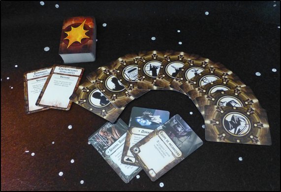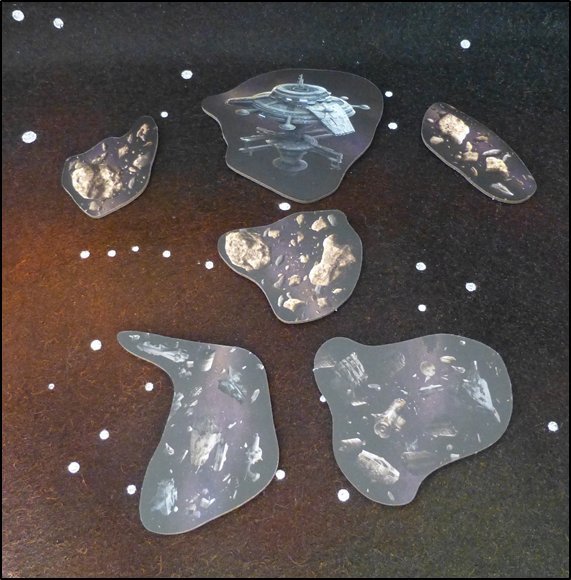 De nombreux autres pions sont également présents : pions de mission, compteur de rounds joués, pion d'initiative, pions d'ordres, pions de défense, etc. L'ensemble est toujours de la qualité habituelle de FFG, c'est à dire excellente. Des gabarits de décors sont également fournis. Ils représentent des champs d'astéroïdes (moyennement dangereux si on passe dessus), des champs de débris spatiaux (dangereux si on passe dessus) et une station spatiale (permet des réparations si on passe dessus). Si la station spatiale est plutôt passe partout, le reste est plutôt joli. On appréciera en tout cas d'avoir plus de variété que dans la boite de base X-Wing Miniatures.