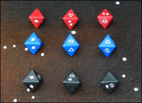 On termine cette revue du matériel avec les dés spéciaux à huit faces permettant de résoudre les attaques (les défenses des vaisseaux ne sont pas gérées avec des dés). Ils sont de trois types : rouges, bleus et noirs. Les noirs représentent les tirs à courte portée, les bleus les tirs à courte et moyenne portées et les rouges les tirs à courte, moyenne et longue portées. Chaque série de dés possède ses propres faces. On notera que les dits dés sont plutôt classiques et, surtout, qu'ils sont en nombre insuffisant ! Etant donné le prix de la boite (près de 100€), on peut estimer que l'éditeur se fiche un petit peu de ses clients. Il est clair qu'il souhaite maximiser les profits en vendants des blisters de dés supplémentaires.