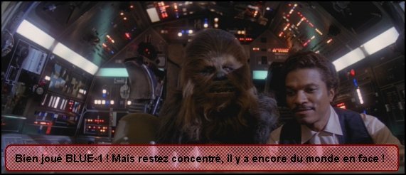 Le Slave I ne constituant plus une menace, le Faucon Millenium se précipita au secours de Blue-2 en détruisant le dernier chasseur de l'Escadron Noir. Malheureusement le X-Wing fut abattu par le TIE Intercepteur de Fel...