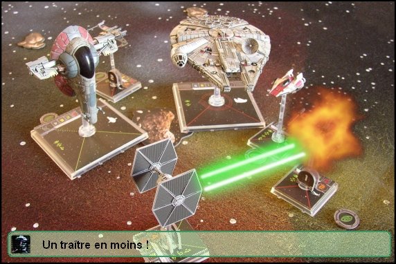 Malgré les pertes, chaque camp refusait de baisser les bras! Lando Calrissian et Chewbacca prirent le Slave I pour cible : leurs tirs détruisirent les écrans du vaisseau de Boba Fett et un coup au but l'immobilisa définitivement! Dans le même temps, le dernier X-Wing luttait contre les TIE Impériaux.
