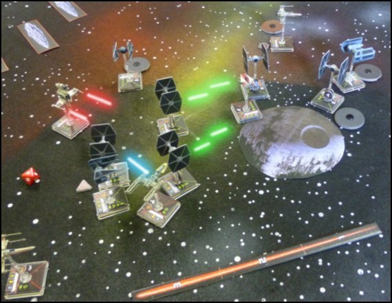 La réplique rebelle fut malheureusement piteuse. Les chasseurs TIE de l'escadron Noir parvenaient en effet à esquiver tous les tirs ! ![]() ![]() Les chasseurs impériaux et rebelles se lancèrent alors dans une terrible danse mortelle. Si les rebelles progressaient vers l'Etoile de la Mort, ils encaissaient de nombreux tirs et leurs écrans déflecteurs commençaient à souffrir. Gold Leader en particulier semblait être la cible privilégiée des impériaux qui devaient l'avoir identifié comme le fer de lance de l'attaque. ![]() Soudain les senseurs rebelles détectèrent la disparition du champ de force autour de l'Etoile de la Mort. Sur Endor, le commando mené par le Général Solo avait manifestement réussi à en détruire le générateur. ![]() Le Faucon Millenium se lança vers la station spatiale alors que les impériaux encaissaient leur première perte avec l'explosion d'un Bombardier TIE. Mais Gold Leader était suivi de près par les chasseurs des escadrons Noir et Alpha. ![]() Avec la destruction de Gold Leader, le moral des rebelles s'effondra. A l'exception de son Aile A, toujours pilotée d'une main de maître, l'escadron Rouge était englué dans la chasse impériale. ![]() L'Aile A de l'escadron Rouge parvint bien à s'approcher de l'Etoile de la Mort mais son pilote était trop occupé à esquiver les tirs impériaux pour espérer pouvoir tenter une attaque contre la station. ![]() De son côté l'escadron Bleu rebelle affrontait les chasseurs impériaux de l'escadron Gamma. Mais même la puissance de l'Aile B ne parvenait pas à faire la différence face à l'agilité dont faisait preuve les pilotes adverses. ![]() La chasse impériale commençait à subir des pertes avec la destruction de plusieurs chasseurs TIE. Mais la plupart des nouveaux modèles de type Intercepteur, pilotés par des as, restaient pleinement opérationnels. ![]() Les détecteurs rebelles repérèrent enfin la source du brouillage impérial. Une balise était cachée dans un champ d'astéroïdes. Malgré une Aile X déjà bien endommagée, Blue Leader prit la direction de cette nouvelle cible. Mais il était pourchassé par un chasseur TIE qui l'abattit avant qu'il n'atteigne la sécurité relative des astéroïdes. ![]() ![]()