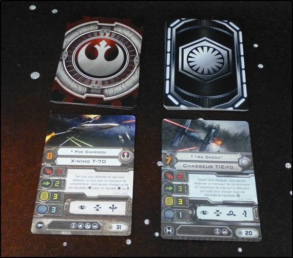 Quelques nouveautés pour les pions et gabarits donc. Par contre rien de bien nouveau pour les cartes de pilote si ce n'est bien entendu l'apparition des logos des nouvelles sous-factions de la Résistance et du Premier Ordre. On continue à regretter que les cartes de pilote se contentent de nous montrer les chasseurs pilotés et non les pilotes eux-mêmes. Cela rend leur identification en cours de jeu plus compliquée. Et cela les rend plus impersonnel aussi. D'autant plus impersonnel qu'il n'y qu'un ou deux pilotes nommés du côté de la Résistance et uniquement des pilotes anonymes côté Premier Ordre.