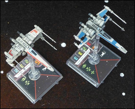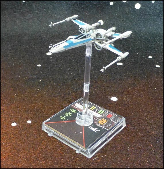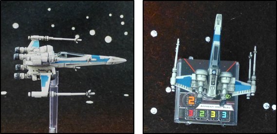 passe à côté de l'essentiel, à savoir les figurines... Comme nous l'avons dit en introduction, si cette nouvelle boite de base a un air de déjà vu, les différences avec la boite précédente sont subtiles mais existent bien. C'est la même chose avec les figurines. A première vue on a l'impression de ne rien voir de nouveau et pourtant ces nouveaux X-Wing et TIE Fighters sont bien différents des anciennes versions. Et on commence bien entendu par le X-Wing T-70 de la Résistance ! On dirait un bête X-Wing T-65 en livrée