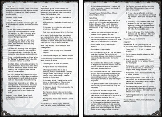 Le Guide d'Apprentissage permet aux joueurs d'apprendre les bases du jeu de manière classique avec description des tours de jeu, diagrammes et autres explications sur le déroulement d'une partie. Ce livret ne s'attarde cependant pas sur le détail de l'ensemble des règles spéciales. Le Livre des Règles regroupe la totalité des règles, règles de base et spéciales, sous la forme d'un lexique. Il permet de retrouver un point de règles très rapidement et, bonne initiative, présente également toutes les règles spéciales introduites dans les différentes extensions (canons à ion, occultation, mines, etc.). Cependant ce livret ne présente aucun diagramme ou aucun exemple et il ne rend pas le Guide d'Apprentissage complètement inutile aux vétérans. ![]() Le Livret de Règles est pratique mais aride... Les règles présentées dans cette boite de base sont majoritairement identiques à celles de la précédente, les différences les plus spectaculaires sont les suivantes :