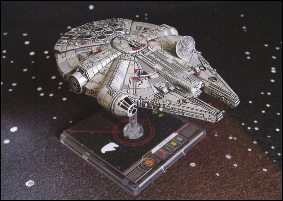 Mais c'est bien entendu la figurine qui interpelle le joueur en premier. Le Faucon Millenium est un grand vaisseau qui écrase les chasseurs par sa taille. La figurine est à la hauteur des précédentes productions avec de nombreux détails et une peinture très réussie, on se croirait vraiment en présence du mythique vaisseau! Les caractéristiques principales